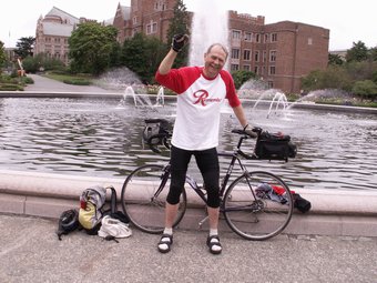 Bill Harrison celebrates his arrival at the landmark fountain on the University of Washington campus was the final destination for both Vic and Ray—the 1909 riders whose journey was chronicled in the book, Two Wheels North (published by Oregon State University Press), and for Harrison 100 years later.