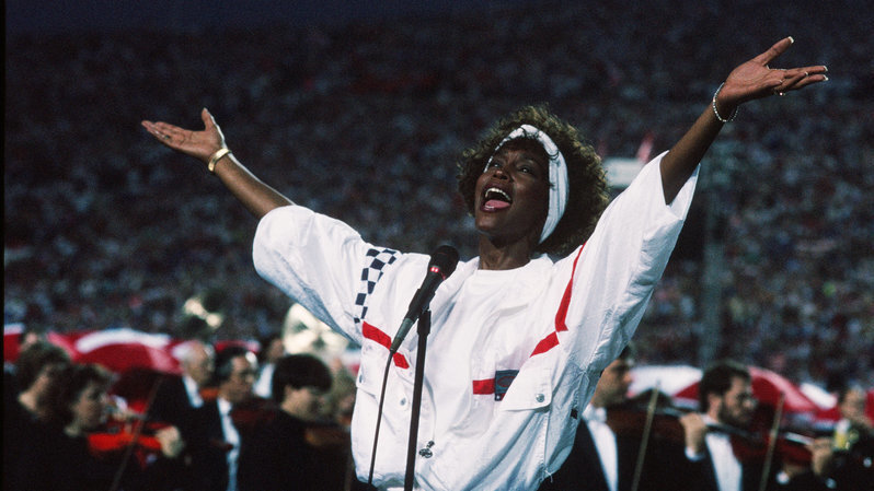 Singer and actress Whitney Houston sings the National Anthem at the 1991 Tampa, Florida, Superbowl XXV. Houston's rendition of the National Anthem was particularly inspiring due to the fact that Superbowl XXV (25) was held as the first Gulf War began.