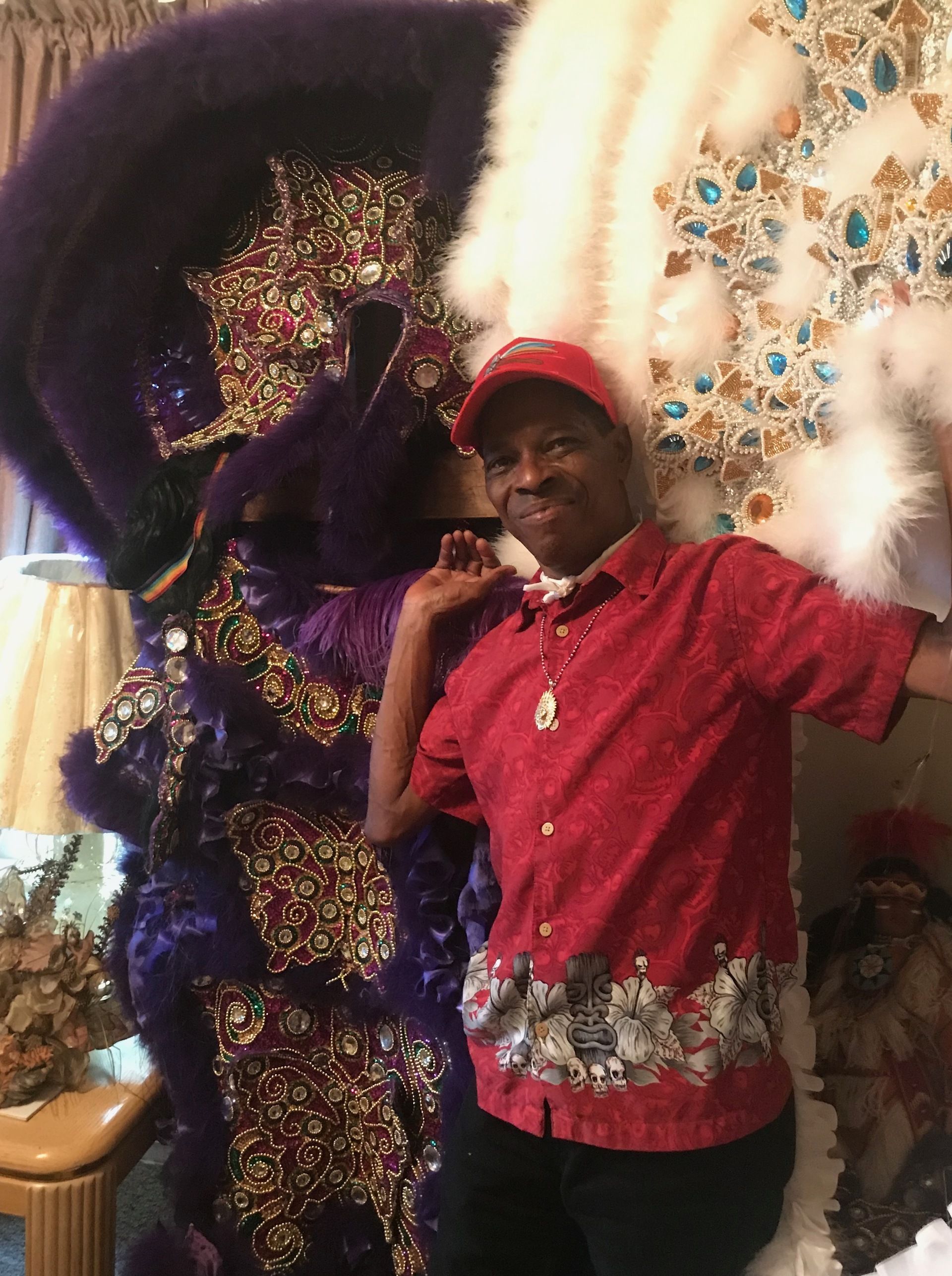 I visited Big Chief Lil Charles Taylor of the White Cloud Hunters in his living room, where he has plumes, satin and feathers on display. Like any good Mardi Gras Indian, he hand-sews his suits. Taylor says he's been parading — except in times of illness — since he was 2 years old. He's 65 this year.