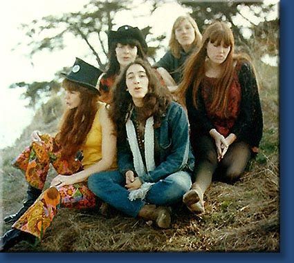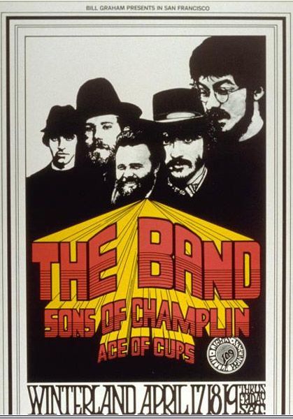 The Ace of Cups were the first and only all-female band in the San Franciso music scene of the late 1960s. They played frequently at all of the popular venues of the era, including the Fillmore, Avanlon Ballroom, and, as shown on the reproduced poster below, the Winterland auditorium. Drummer Diane Vitalich (wearing the yellow shirt and top hat in the group photo at right) recounts how the five band members found each other, beginning when she was found drumming at a jam session.