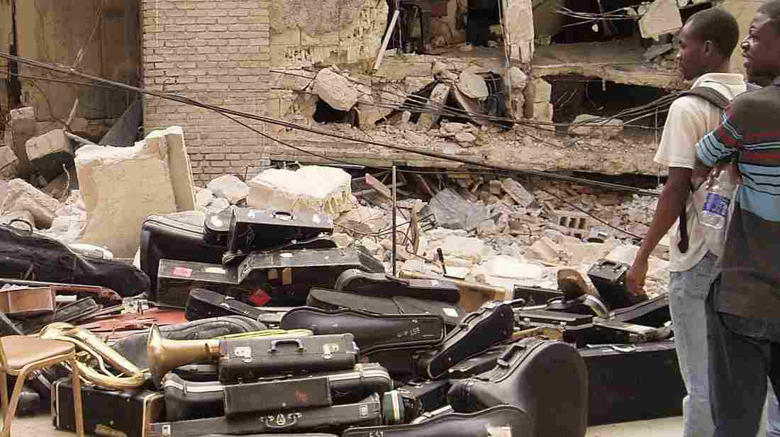 Members of Holy Trinity Music School salvage instruments after the 2010 earthquake in Port-au-Prince. Stephen Davenport/Serenade for Haiti hide caption