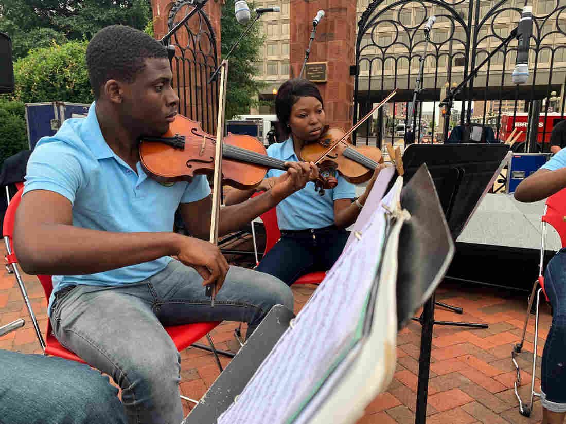 A chamber ensemble from Holy Trinity Music School performs pieces by Haitian composers on the National Mall. Pictured: Violinists Kerdy Freud Exe Jeunesse (left), 17, and Hilary Herva Philistin, 19. Melissa Block/NPR hide caption