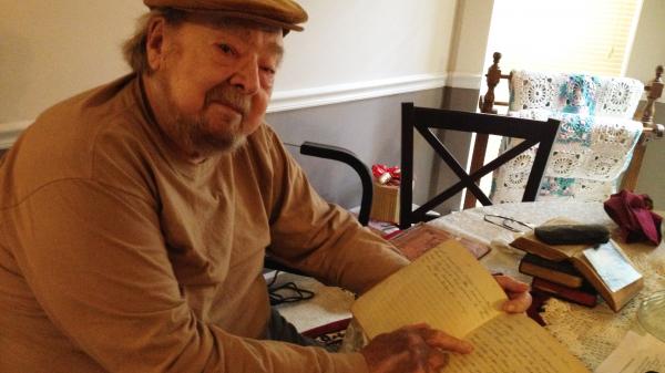 On top of the table sit a few composition books that aren't much younger. Their lined pages are yellowed with age, but they hold still-legible song lyrics, thanks to his mother Ruth's good penmanship.