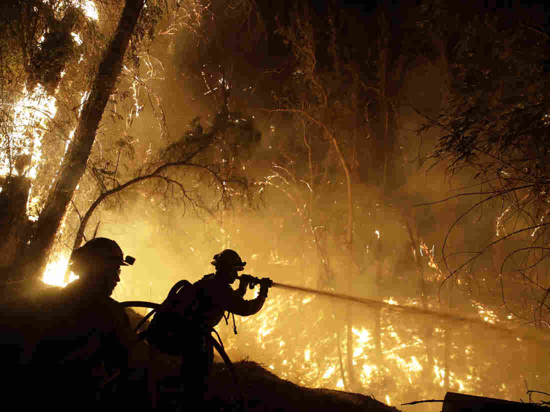 Firefighters battle the Maria Fire on Friday, Nov. 1, 2019. Marcio Jose Sanchez/AP hide caption