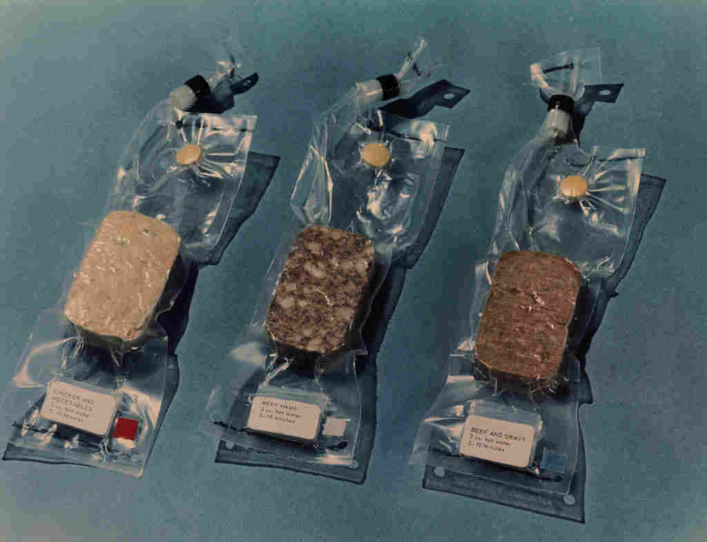 Some of the space food that was scheduled to be carried on the Apollo 11 lunar landing mission included (from left to right): chicken and vegetables, beef hash, and beef and gravy.