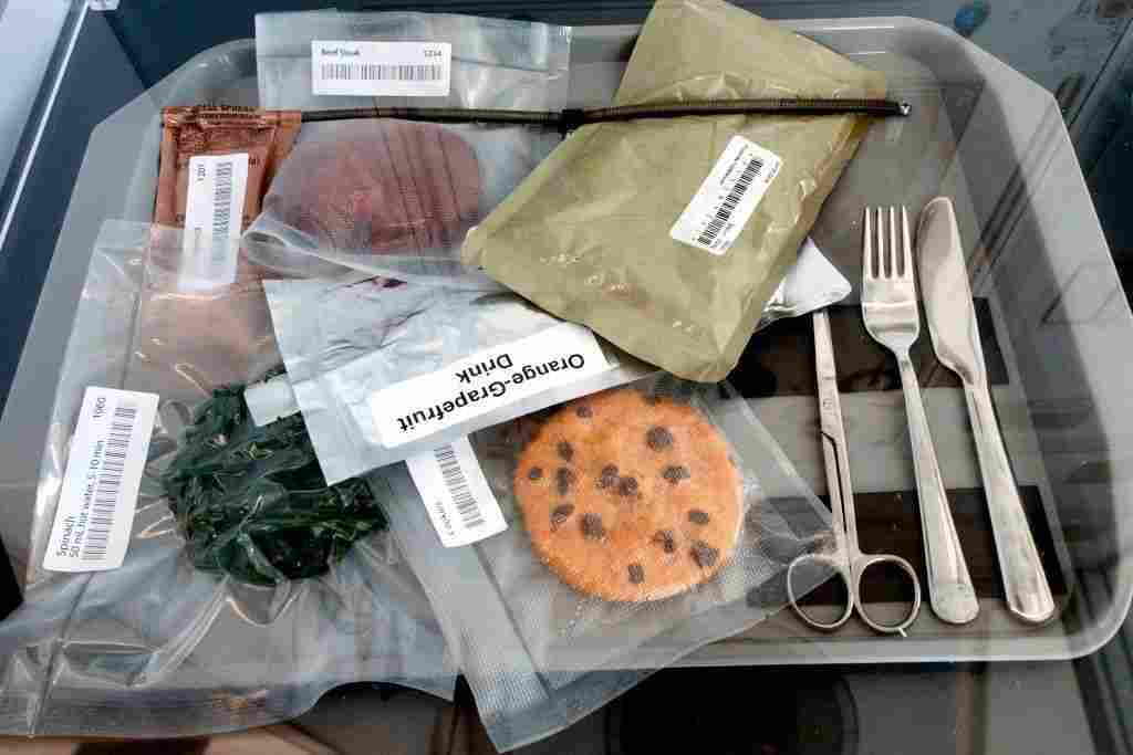 Vacuum-sealed space food — including a beef steak, spinach, a cookie, and an orange grapefruit drink — was on display inside the NASA lunar habitat, designed by Lockheed Martin, during the 35th Space Symposium in Colorado Springs, Colo., in April.