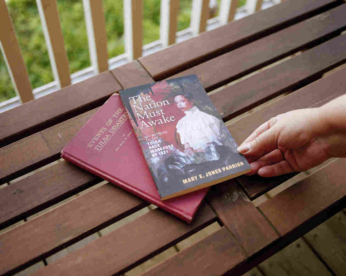 A copy of the original book Events of the Tulsa Disaster and the newly published version, The Nation Must Awake, written by Mary E. Jones Parrish sits on Bruner's porch. Nate Palmer for NPR hide caption