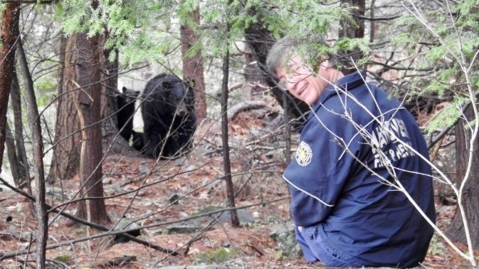 Hanover, N.H., Deputy Fire Chief Michael Hinsley in the woods with Mink the bear.