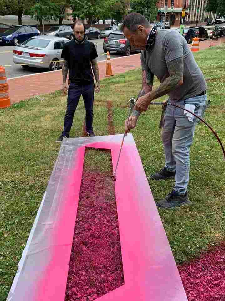 Using a giant protractor mat, she set out the lines she had sketched first on paper. She marked lines with pink twine, aided by the street team from the Downtown DC Business Improvement District. A crew from the museum helped spray the special non-toxic paint onto the design using a spray paint machine. Another machine painted the lines, in the same manner lines are painted onto a football field.