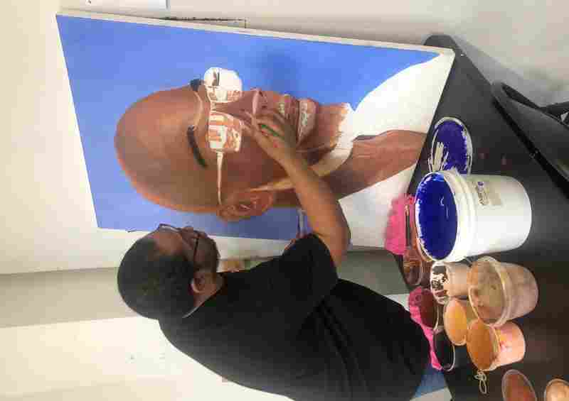 James "Yaya" Hough works on a portrait of Michael "Smokey" Wilson, who was incarcerated for life as a child and served for 46 years. Neda Ulaby/NPR hide caption