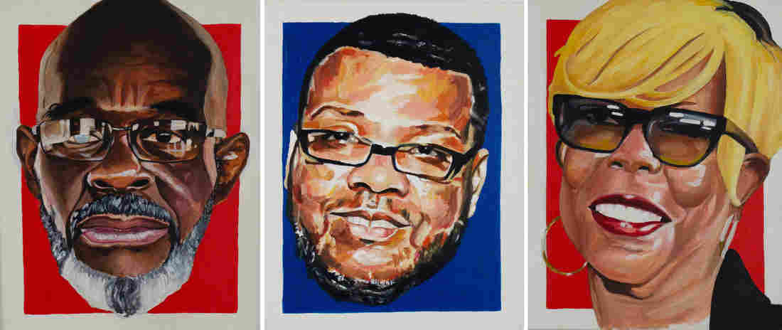 Portraits of Points of Connection created by James "Yaya" Hough, from left, formerly incarcerated returning citizens Michael "Smokey" Wilson and John Pace and victim advocate Dorothy Johnson-Speight. Akeil Robertson/Mural Arts Philadelphia hide caption