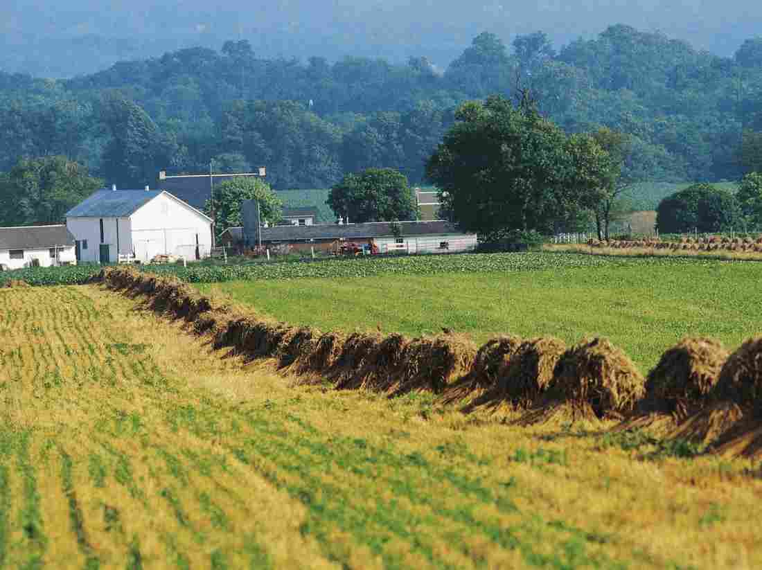 Sheaf of hand-harvested wheat on an Amish farm, Lancaster, Pa. Over the past 30 years the price for an acre of farmland in Lancaster County grew from about $8,000 to $20,000. DEA / G. ROLI/De Agostini via Getty Images hide caption