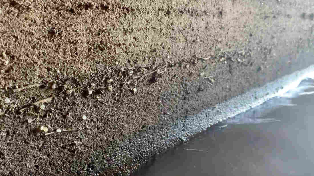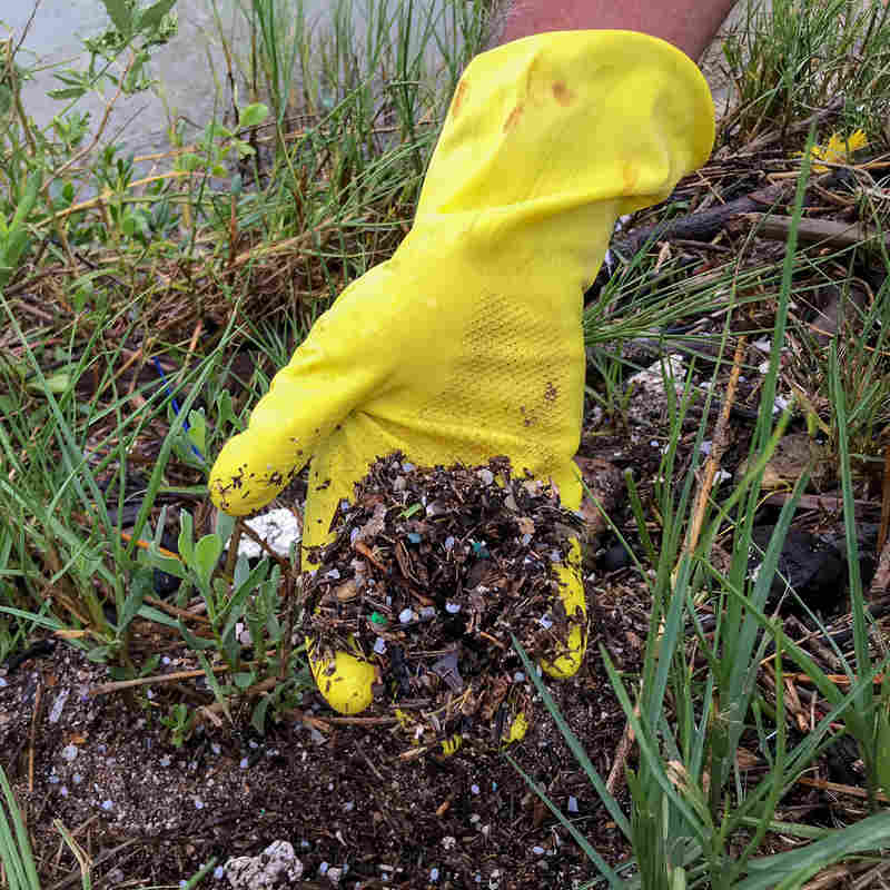 Ronnie Hamrick pulls up the dirt near the Formosa Plastics plant showing dozens of pellets trapped in the mud. Fish and birds often eat the pellets, thinking they are eggs. Laura Sullivan/NPR hide caption