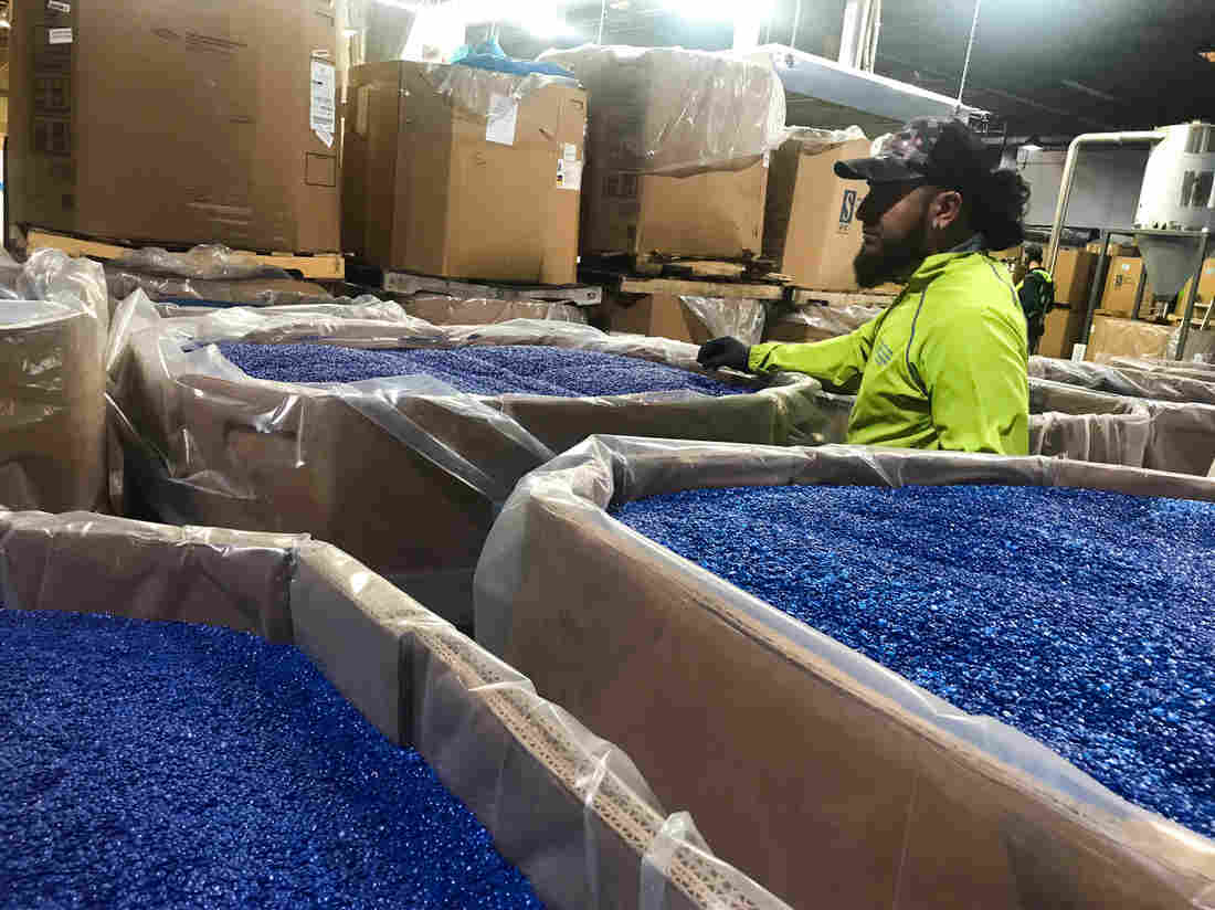 A worker at a plant in New Jersey inspects the quality of the pellets. Melt 350 of them, and you get a yogurt cup. Melt 1,000, and you get a water bottle. Laura Sullivan/NPR hide caption