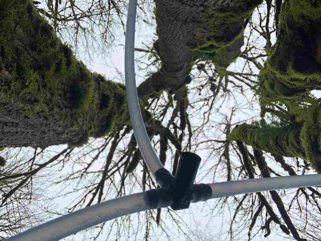 Looking up at massive bigleaf maple trees towering over a tapping system to extract their sap for syrup in Acme, Wash.