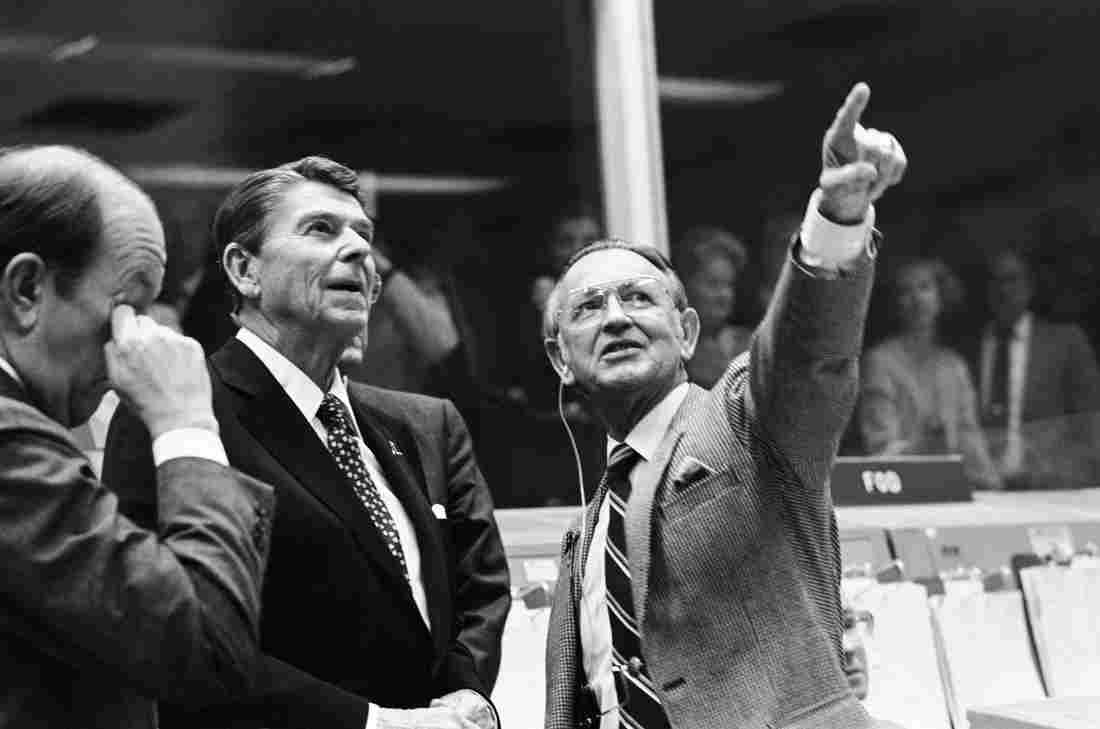 Kraft, then the Johnson Space Center director, shows NASA's mission control to President Ronald Reagan in 1981. NASA hide caption