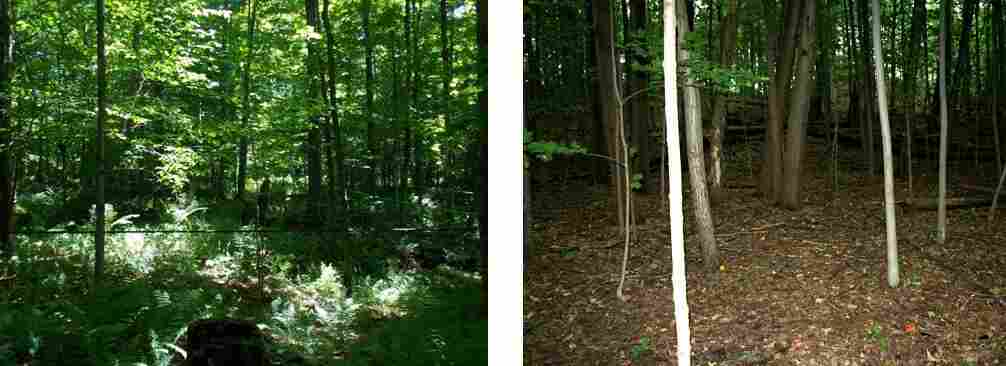 In these images showing two stands of sugar maple trees, the one on the left has not been invaded by Asian crazy worms, and the one on the right has. Josef Görres/Plant and Soil Science Department University of Vermont hide caption