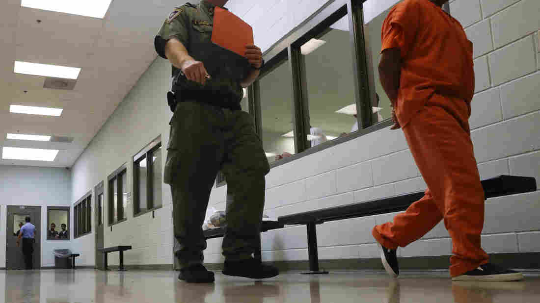A guard walks with a detainee in the intake area at the Adelanto ICE Processing Center in 2019. A previously-confidential report obtained by NPR found "negligent" medical care and other problems at the facility.