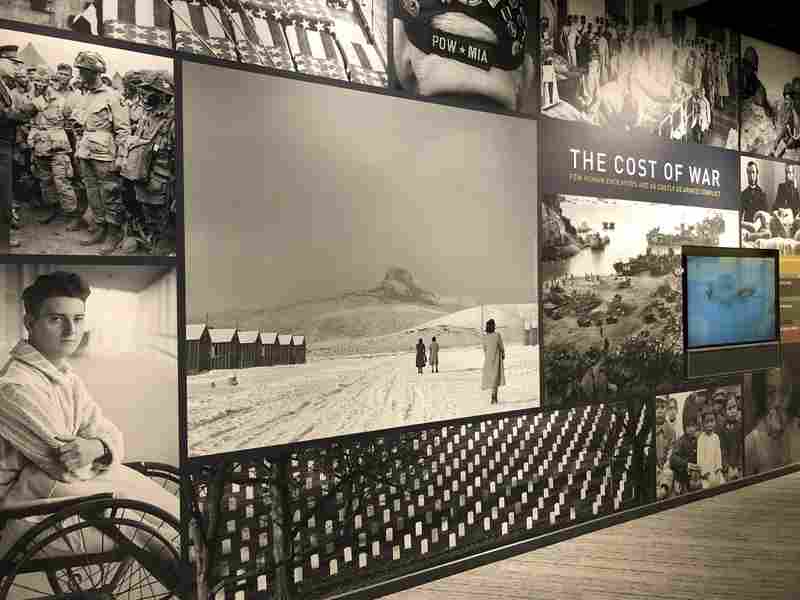 "As we're walking into this gallery, really the first thing you encounter is this big graphic," Hlebinsky said. "And some of the images you see when you walk into the gallery are the gravestones at the Arlington Cemetery and children affected by war."