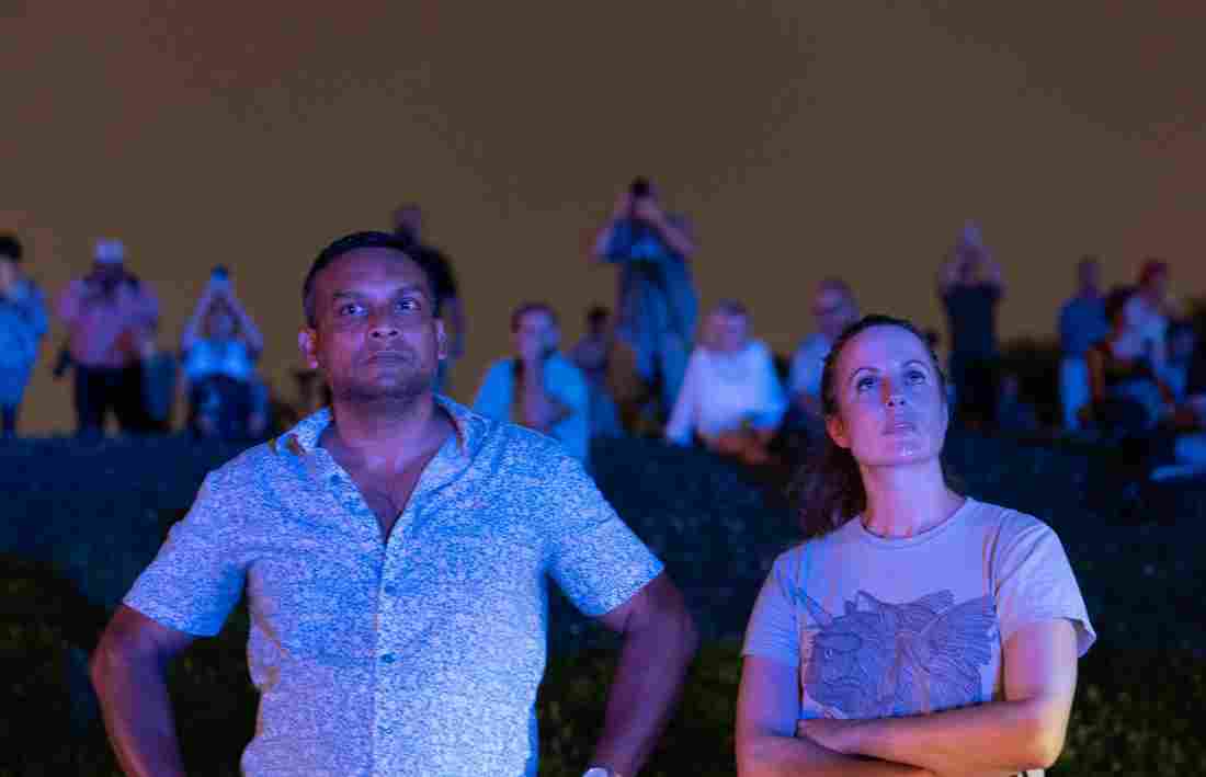 Sanjeewa and Heather Wickramarachi enjoy their time at the display. Shuran Huang/NPR hide caption