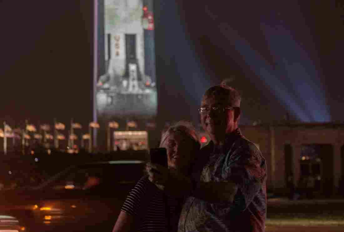 Sarah and Mark Moser traveled from Oakland, Calif., and were excited to see the projection. "I remember we watched the launch on TV when we were kids," Mark Moser said. Shuran Huang/NPR hide caption