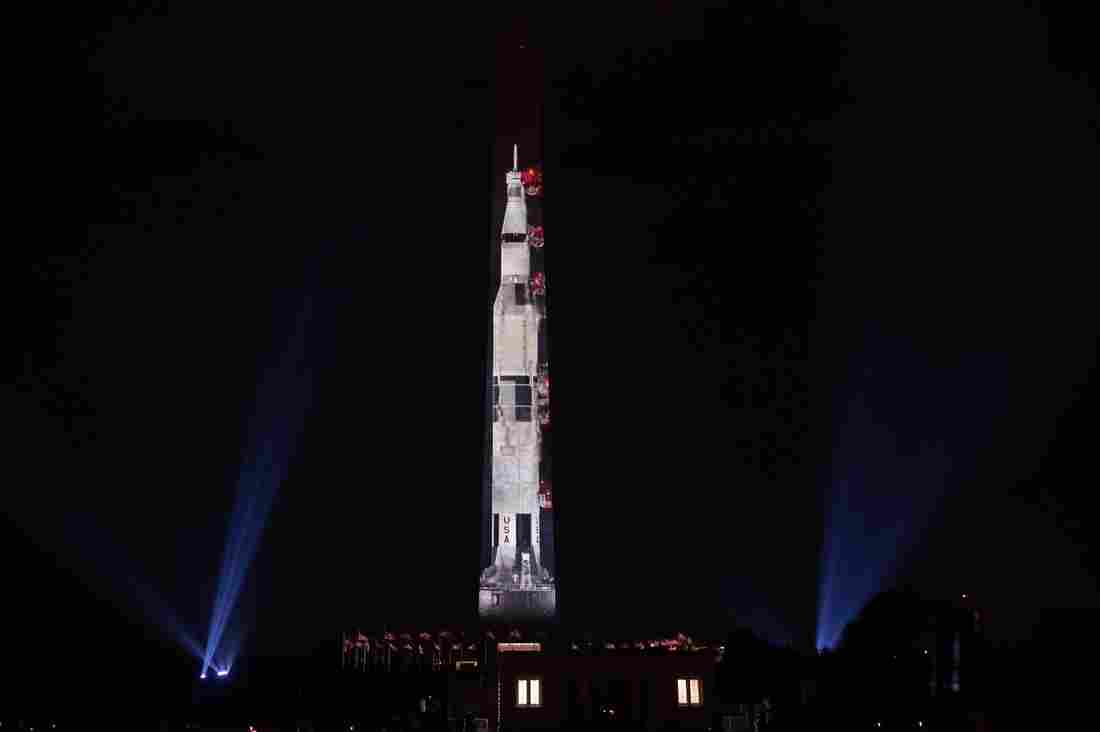 Shuran Huang/NPRThe Saturn V rocket is now iconic for carrying the Apollo 11 crew to the moon in 1969. The projection-mapping artwork will occupy 363 of the monument's 555 vertical feet.