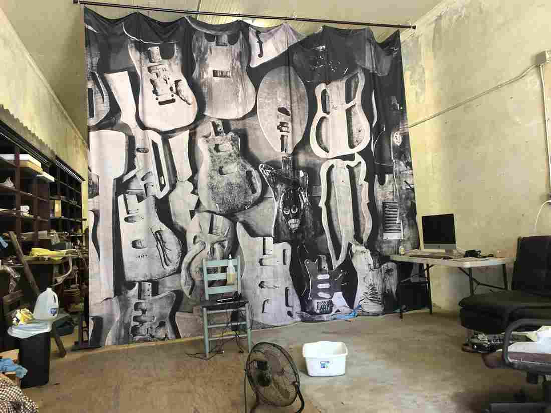 At the center of the room, Vines guitars hang from rafters in the ceiling.
