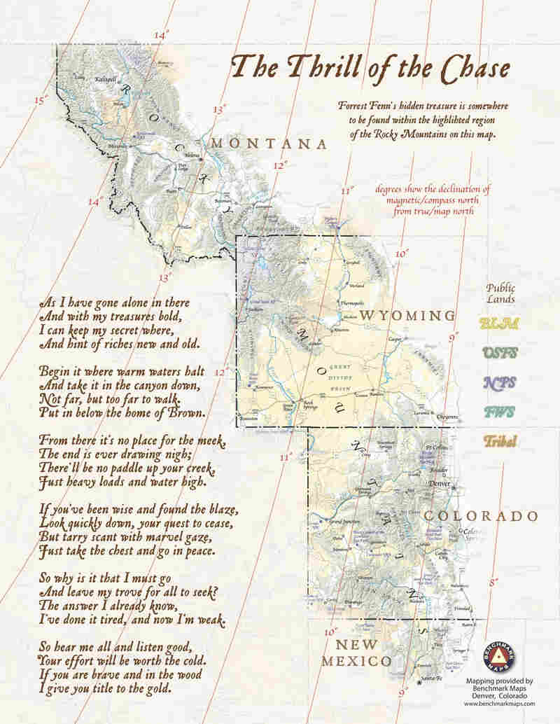 The treasure map and poem from Fenn's book. Benchmark Maps/Courtesy of Forrest Fenn hide caption