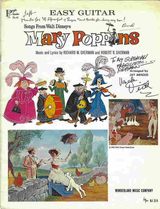 Mary Poppins memorabilia from Jeffrey Sherman's childhood, with special dedication from the Sherman Brothers. Robert Sherman's dedication reads, "Jeff --Thanks for 'A Spoonful of Sugar' and thanks for being my son! Dad." Jeffrey Sherman hide caption