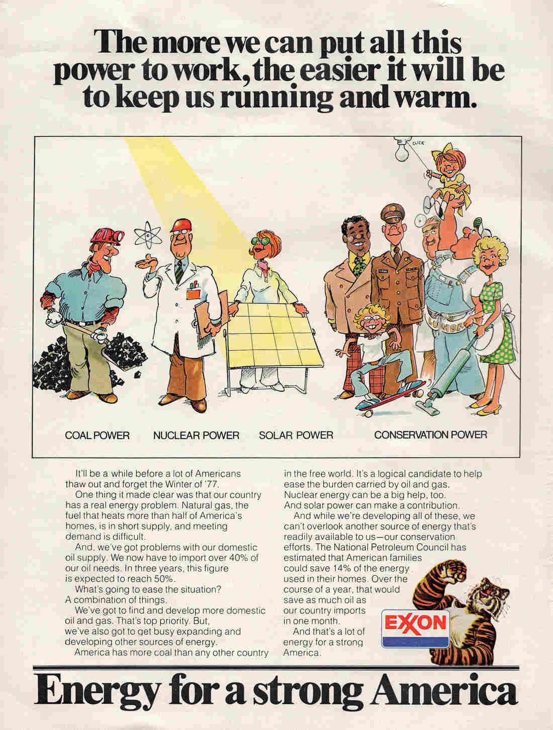 Exxon ran a print and television ad campaign with the slogan "Energy for a strong America," showcasing various ways the company was working to secure energy for the country — with solar featured alongside coal and nuclear power.