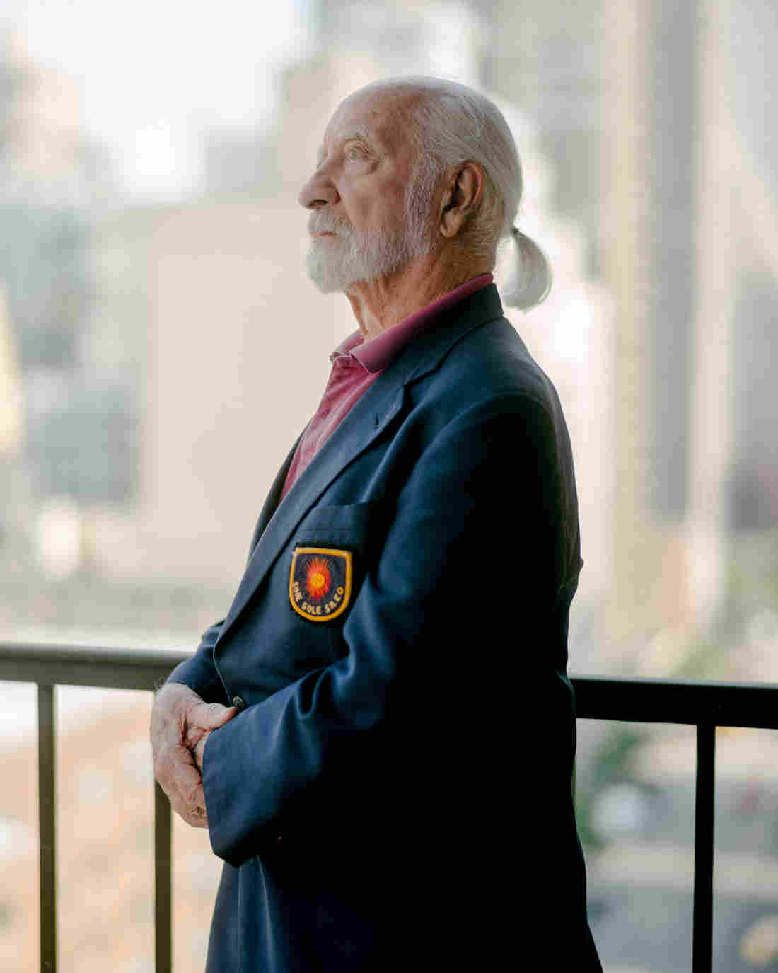 Elliot Berman, on the balcony of his New York City apartment, wears a boat jacket that he and his team donned for meetings with the boating industry about their solar panels. On the pocket is a drawing of a sundial and the Latin phrase Sine sole sileo —"Without sun, I'm silent." Elias Williams for NPR hide caption