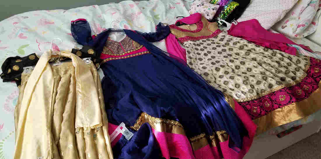 The traditional Indian clothing of Sarita Talusani Keller's daughter, 9-year-old Leela, is laid out in her bedroom. Every Diwali, she would wear one of these outfits to celebrate the festival. Naina Rao/KUWR hide caption