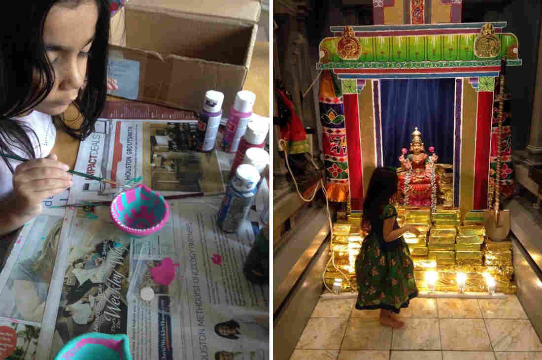 Leela Keller paints a Diya lamp at home preparing for Diwali decorations, in 2016. Right, Leela stands in front of the statue of Hindu goddess Lakshmi, in Sri Meenakshi Temple, located in Madurai, in the state of Tamil Nadu, India. Sarita Keller hide caption