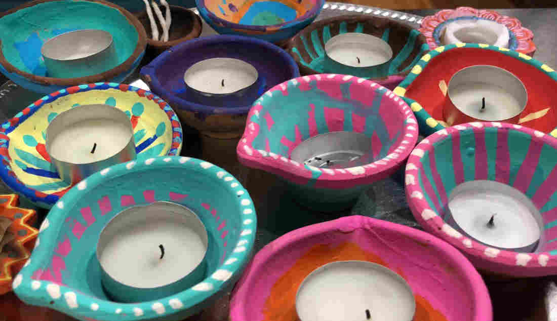 Painted Diyas by Sarita Talusani Keller and her daughter, Leela, laid out on the kitchen counter, ready to be lit for Diwali night in 2017.