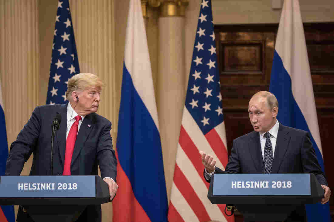 President Trump and Russian President Vladimir Putin answer questions about 2016 U.S. election interference during a joint press conference after their summit on July 16, 2018, in Helsinki, Finland. Chris McGrath/Getty Images hide caption