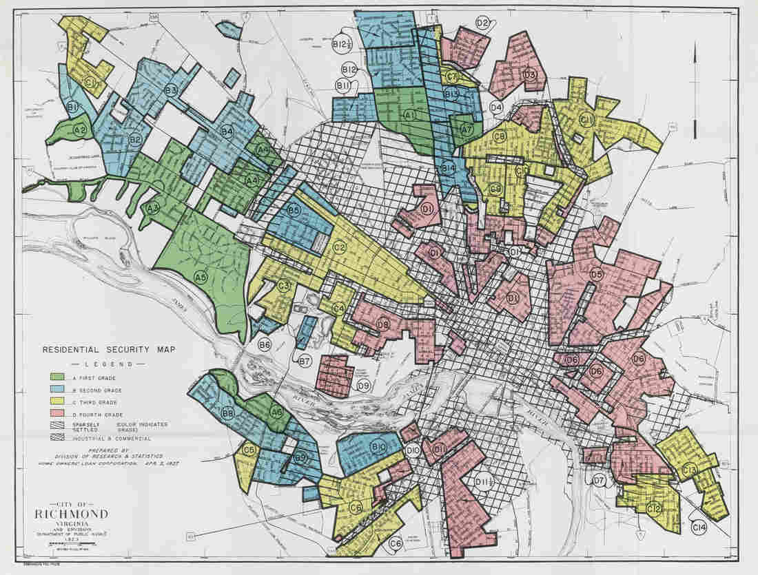 A federal government map of Richmond in the 1930's outlined neighborhoods considered risky (red) for mortgage lenders to offer loans to.