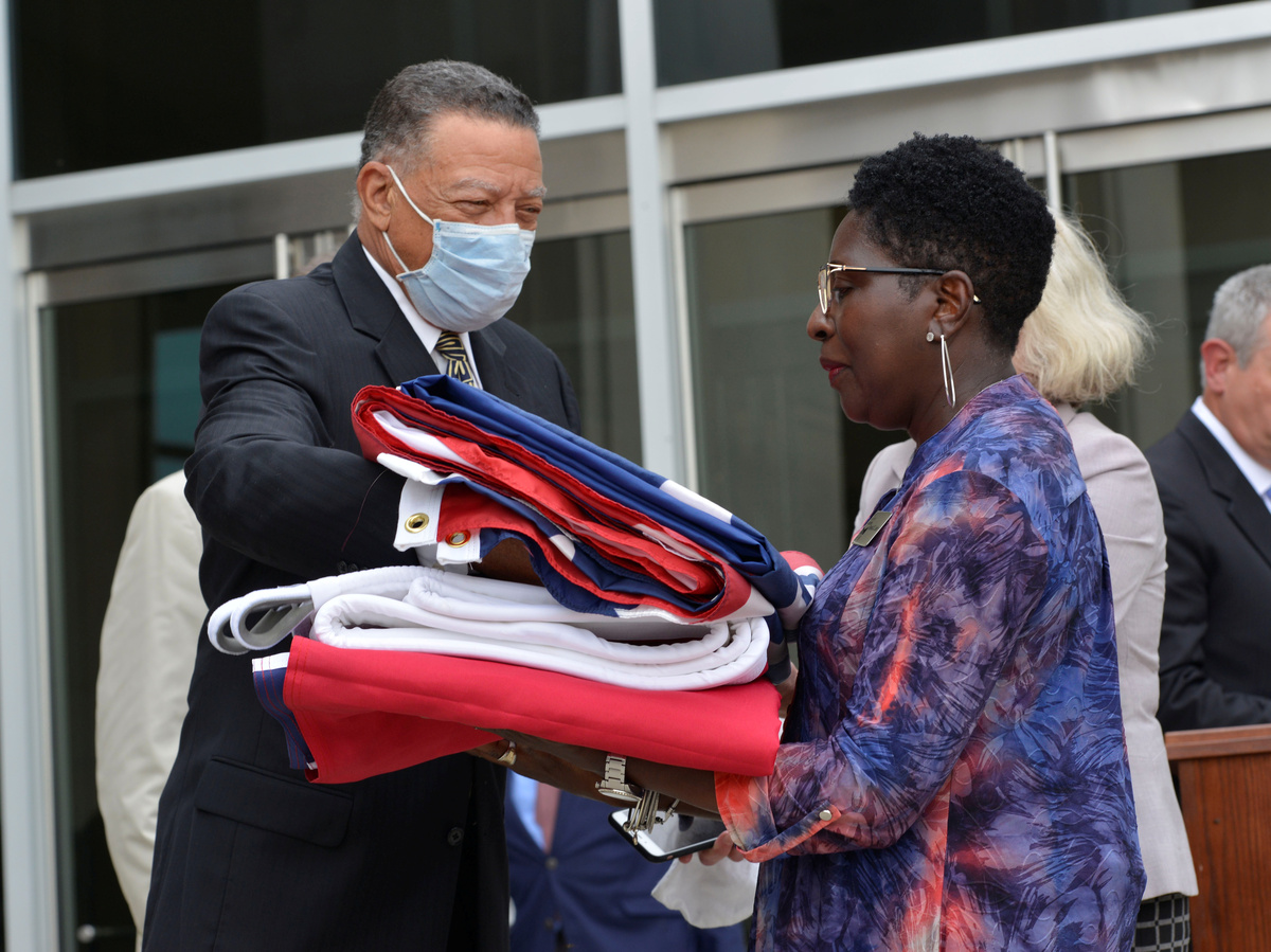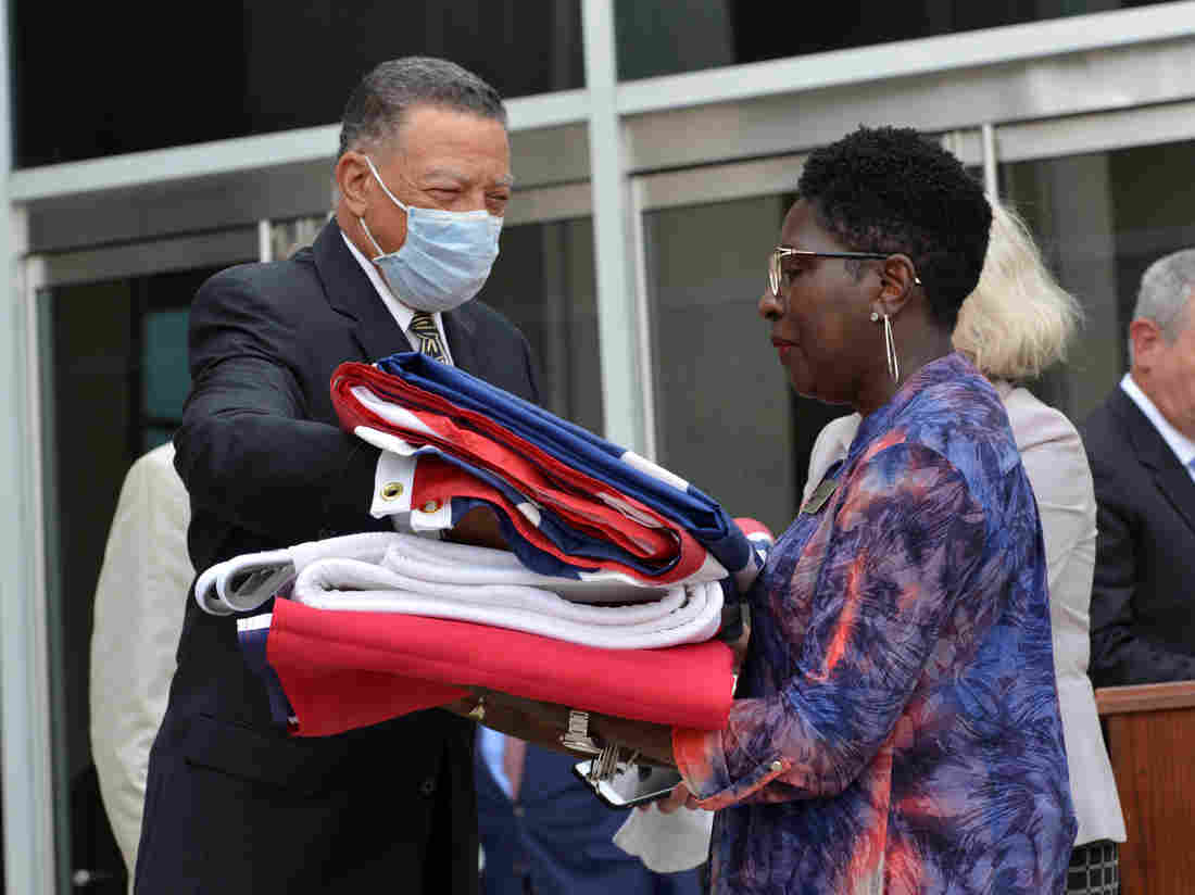 Reuben Anderson (left), former Mississippi Supreme Court justice, hands the Mississippi state flag to Pamela Junior, director of the Two Mississippi Museums, in Jackson, Miss., on July 1, after a bill was signed into law that would replace the state flag that includes a Confederate emblem.