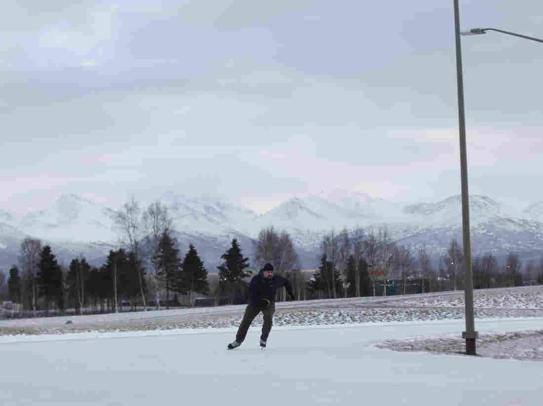 John Blees skates around a speedskating loop in Anchorage. Sports that require less snow, like ice skating and fat-tire bicycling, have become increasingly popular in the city as its climate changes.