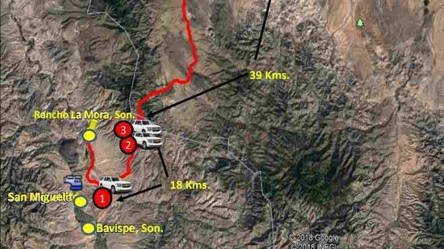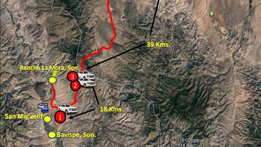 A map handed out by Mexico's federal government Wednesday shows the locations of three vehicles driven by women who died in a brutal attack this week. Six of their children also died, and others were wounded. Mexican government handout hide caption