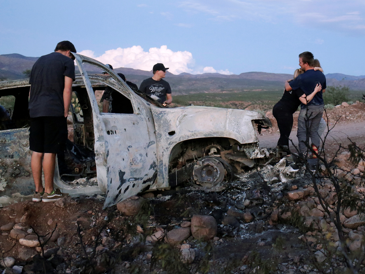 Relatives of slain members of Mexican-American families belonging to Mormon communities visit the burnt wreckage of a Chevrolet Tahoe where five of their relatives died in Bavispe, in the northern Mexican state of Sonora.