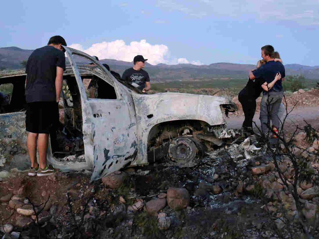 Relatives of slain members of Mexican-American families belonging to Mormon communities visit the burnt wreckage of a Chevrolet Tahoe where five of their relatives died in Bavispe, in the northern Mexican state of Sonora. Jose Luis Gonzalez/Reuters hide caption
