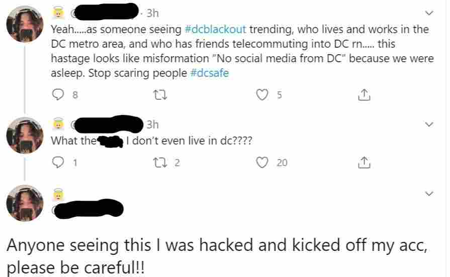 A Twitter user posts about being hacked, after posting a message related to the #DCBlackout disinformation campaign. NPR Screenshot hide caption