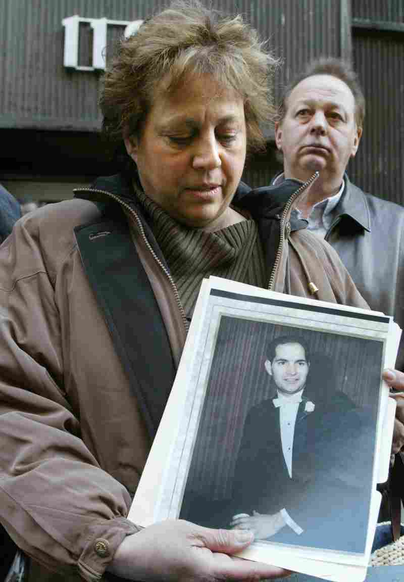 Diane Piagentini, widow of slain police officer Joseph Piagentini, holds a photo of her husband from their wedding day in 1966, after a parole hearing, Friday, Jan. 9, 2004 in New York, to ask that the killers of her husband and his partner not be released on parole. Officers Piagentini and Waverly Jones were killed in 1971 by members of the Black Liberation Army. DIANE BONDAREFF/ASSOCIATED PRESS hide caption