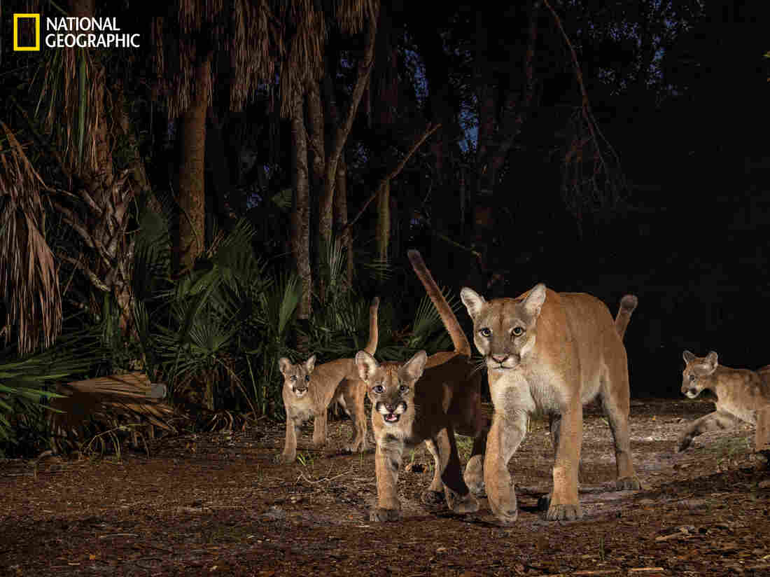 A female and three kittens explore Corkscrew Swamp Sanctuary, a reserve of old-growth cypress forest surrounded by encroaching suburbs. Many of these camera trap images took years to capture because of the cats' rarity, their unpredictable movements and the difficulty involved in getting the right lighting. Weather can be a challenge too: One camera was lost in a hurricane but was later recovered.
