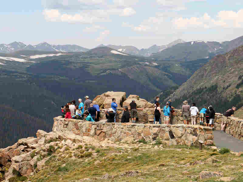 Visitors at a lookout point in Rocky Mountain National Park. Pets are welcome in RMNP, but only in developed campgrounds, roads and picnic areas. They are prohibited on all hiking trails and meadows. NPS/M.Reed/NPS hide caption