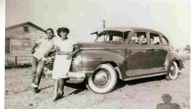 Ricardo "Papu" Ovilla, left, and the family's first car. Ovilla is pictured with his children Martha (next to him) and Aurelia and Rodolfo Sandoval (left to right, inside the car) in a photo taken in 1949 at a labor camp in Escondido, Calif.