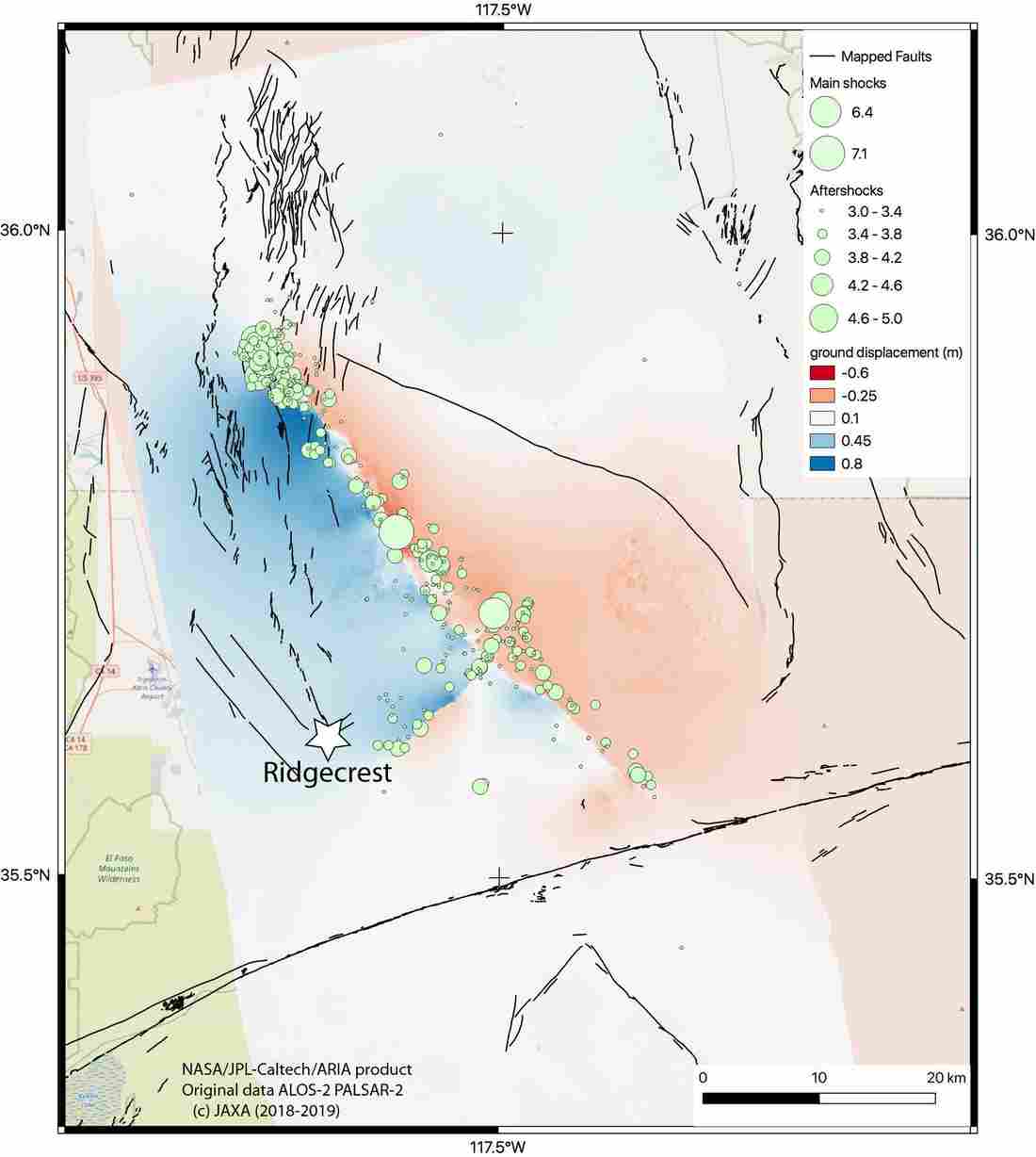 NASA's Advanced Rapid Imaging and Analysis team created this map, which shows surface displacement caused by the recent major earthquakes in Southern California.