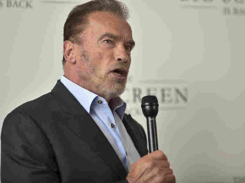 Arnold Schwarzenegger arrives at "The Big Screen is Back" media event. Richard Shotwell/Invision/AP hide caption