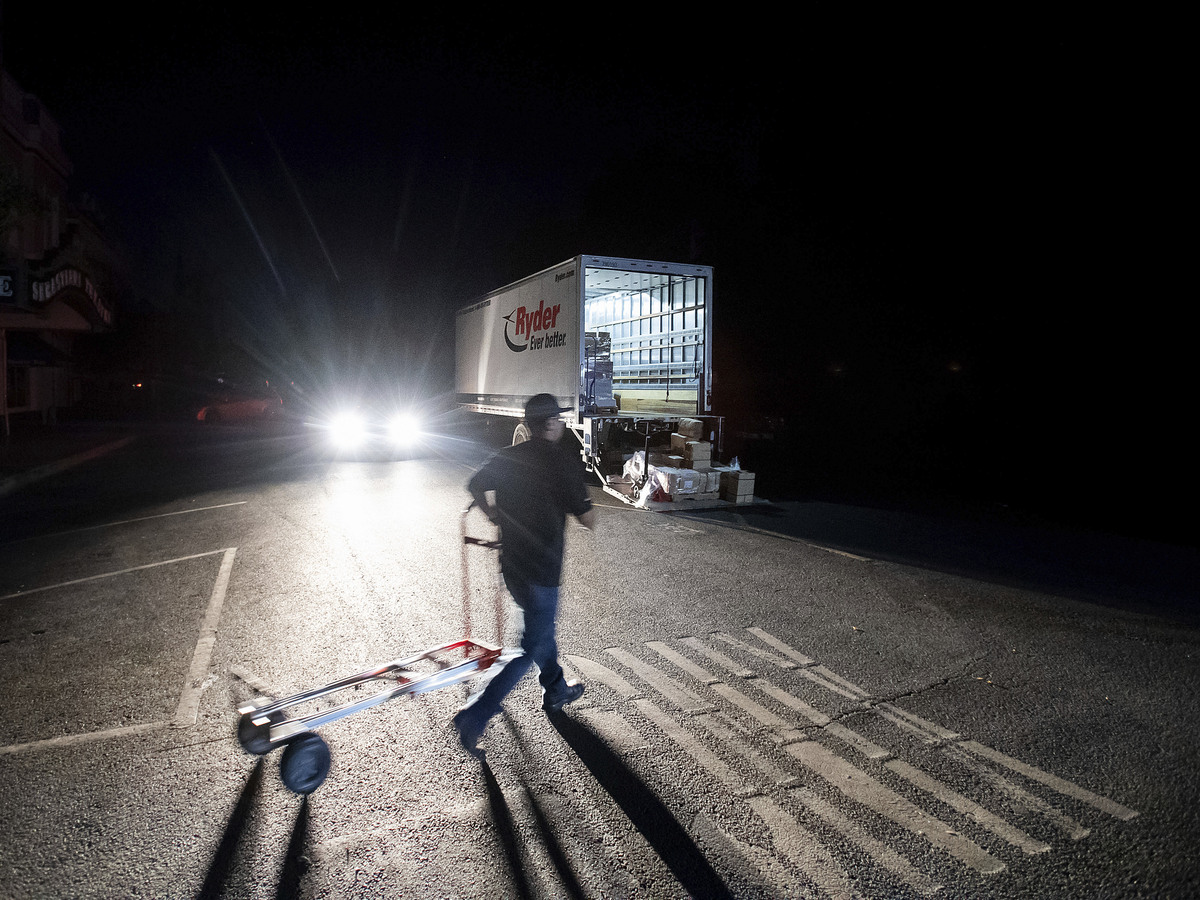 Armando Espinoza delivers paper products to a cafe in downtown Sonoma, Calif., where power is turned off, on Wednesday. Pacific Gas & Electric has cut power to more than half a million customers in Northern California hoping to prevent wildfires during dry, windy weather throughout the region.