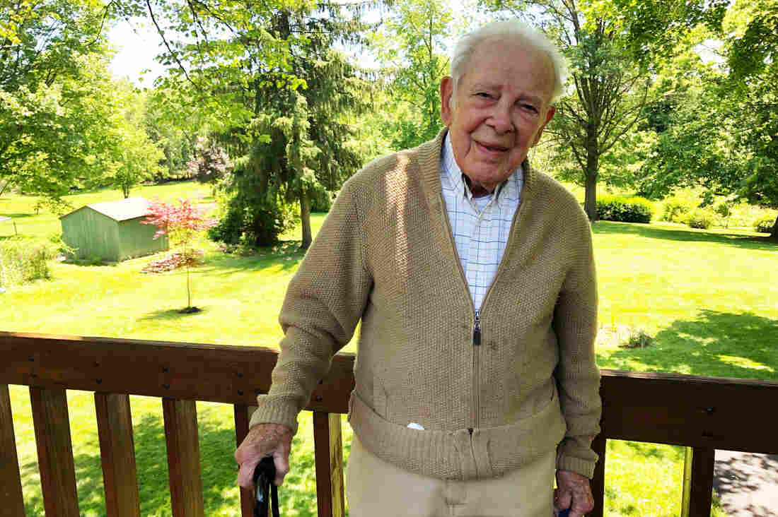 Two days before the 75th anniversary of D-Day, Leslie Cruise poses at his home in Horsham, Pa., on June 4, 2019. William Jones/NPR hide caption